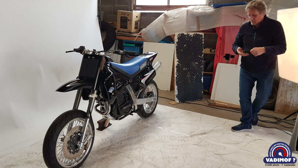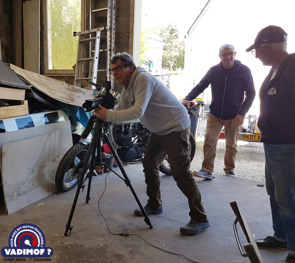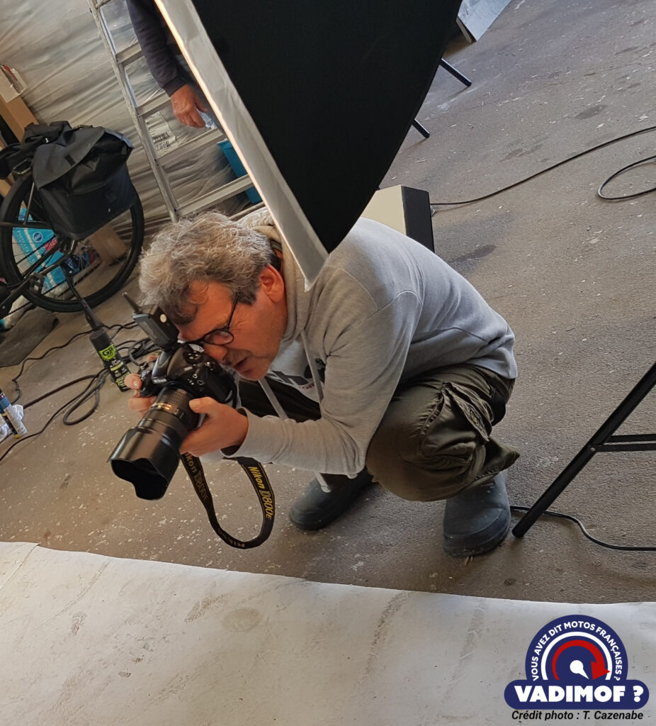 Ci-dessus en pleine séance de travail : Fabrice Berry (à gauche), Patrick Barigault (à droite), Christian Hervet (au fond) un aficionado de la marque qui positionne les motos en fonction des traits au sol, rien n’est laissé au hasard !